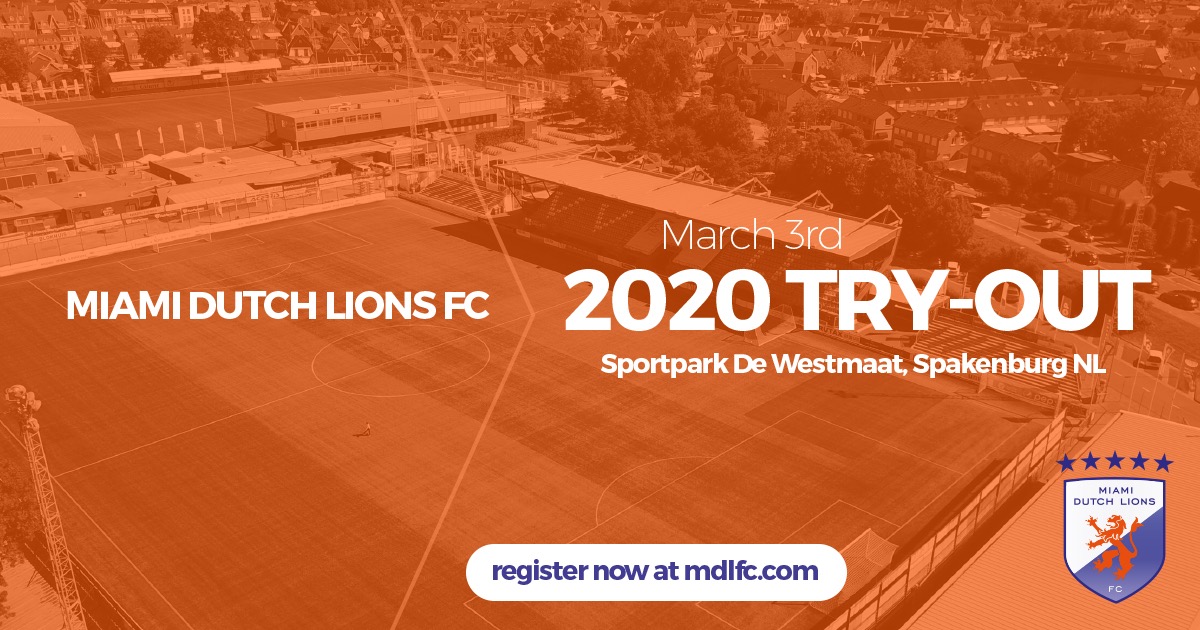 Miami Dutch Lions FC today announced the date and location of the try-out in The Netherlands: Tuesday March 3 at IJsselmeervogels, Sportpark De Westmaat, Westdijk 14 in Spakenburg (NL). There will also be a try-out in February in Miami at Tropical Park Stadium, the exact date will be announced the coming week.